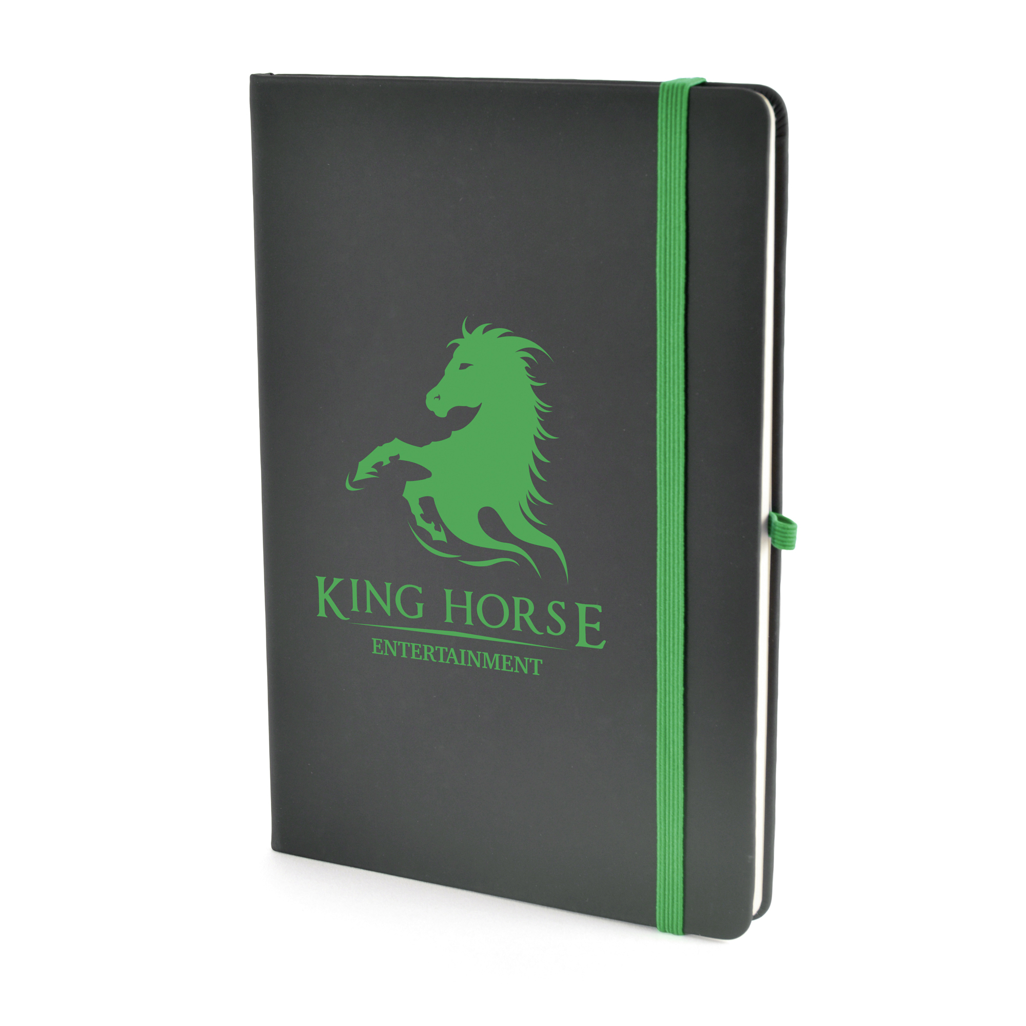 | QS0765GN | 'A5 Black Mole Notebook' with GREEN 355c bookmark, pen loop, closure. | 8885 |