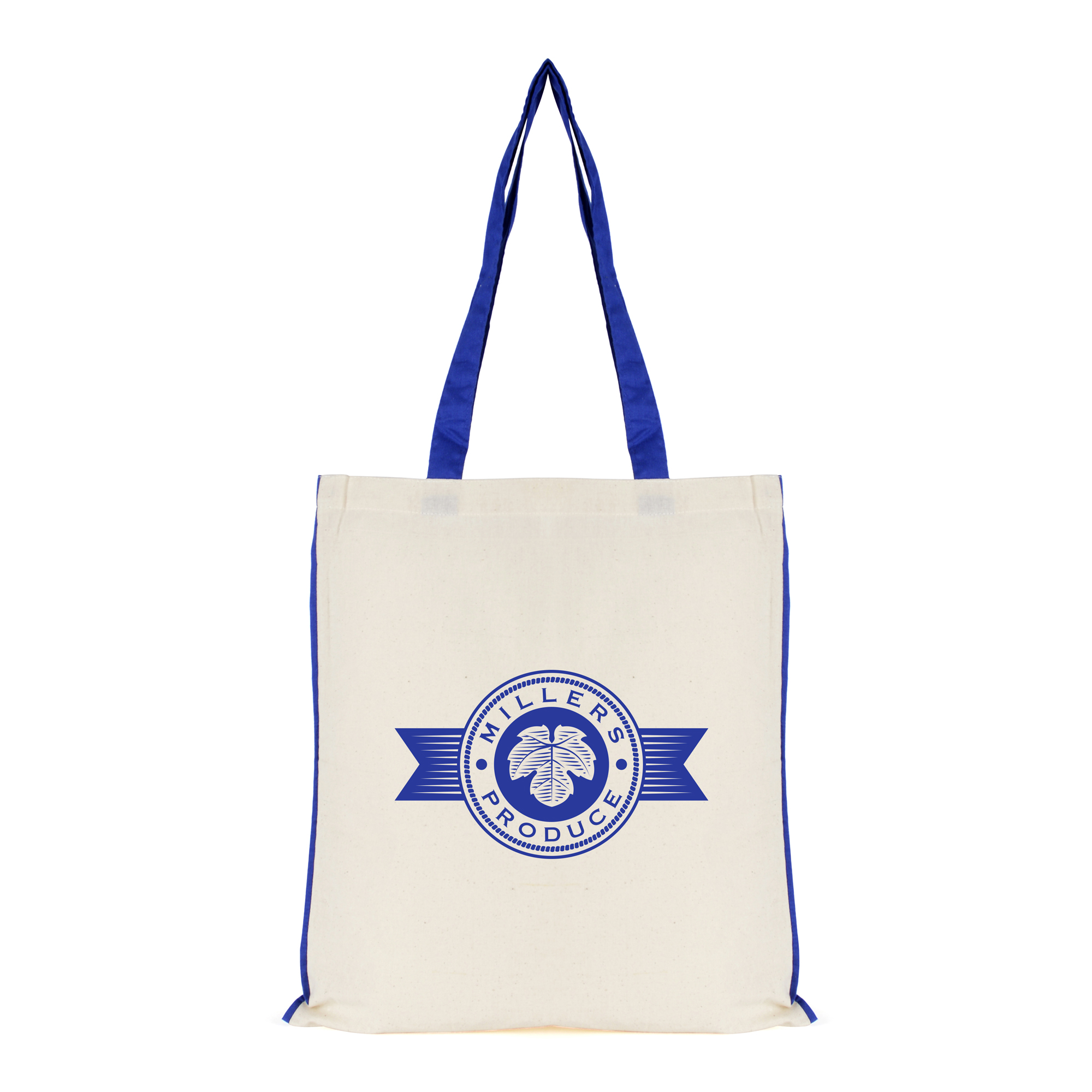 | QB0557RBL | 5oz NATURAL cotton shopper bag with BLUE dyed piping trim + handles | 5282 |
