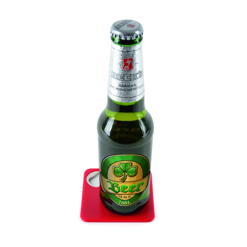 Square plastic coaster with a built-in bottle opener in one corner and a foam grip backing.