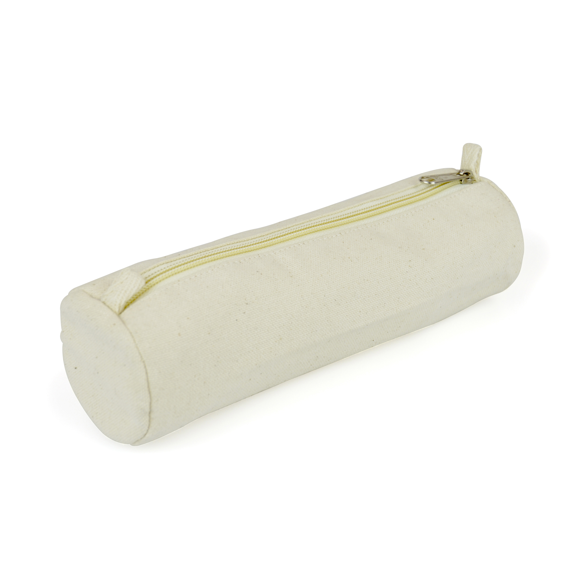 Natural 10oz cotton pencil case in a cylindrical design with zip closure. Available in natural with a silver zip.