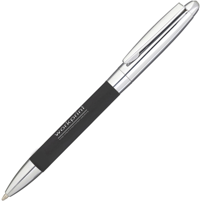 A twist action ball pen with a soft touch matt black barrel and chrome undercoat which is offered as an engraved option only. Price shown are for a standard flat engrave, a larger engrave area (rotary) is available at an additional cost.