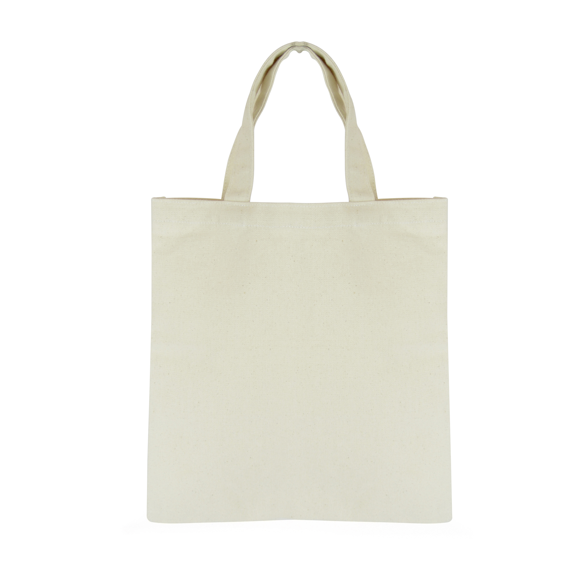 10oz cotton shopper with short cotton fabric handles. Available in natural.