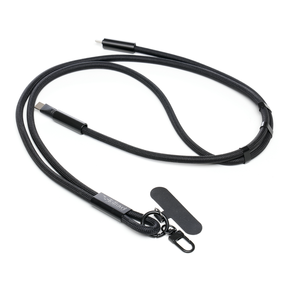 150cm 60W super fast-charging USB-C to USB-C lanyard charger delivers rapid power for phones, tablets, and other devices. Crafted from premium woven materials with metal accents, it features a phone patch attachment and clip for accessories.