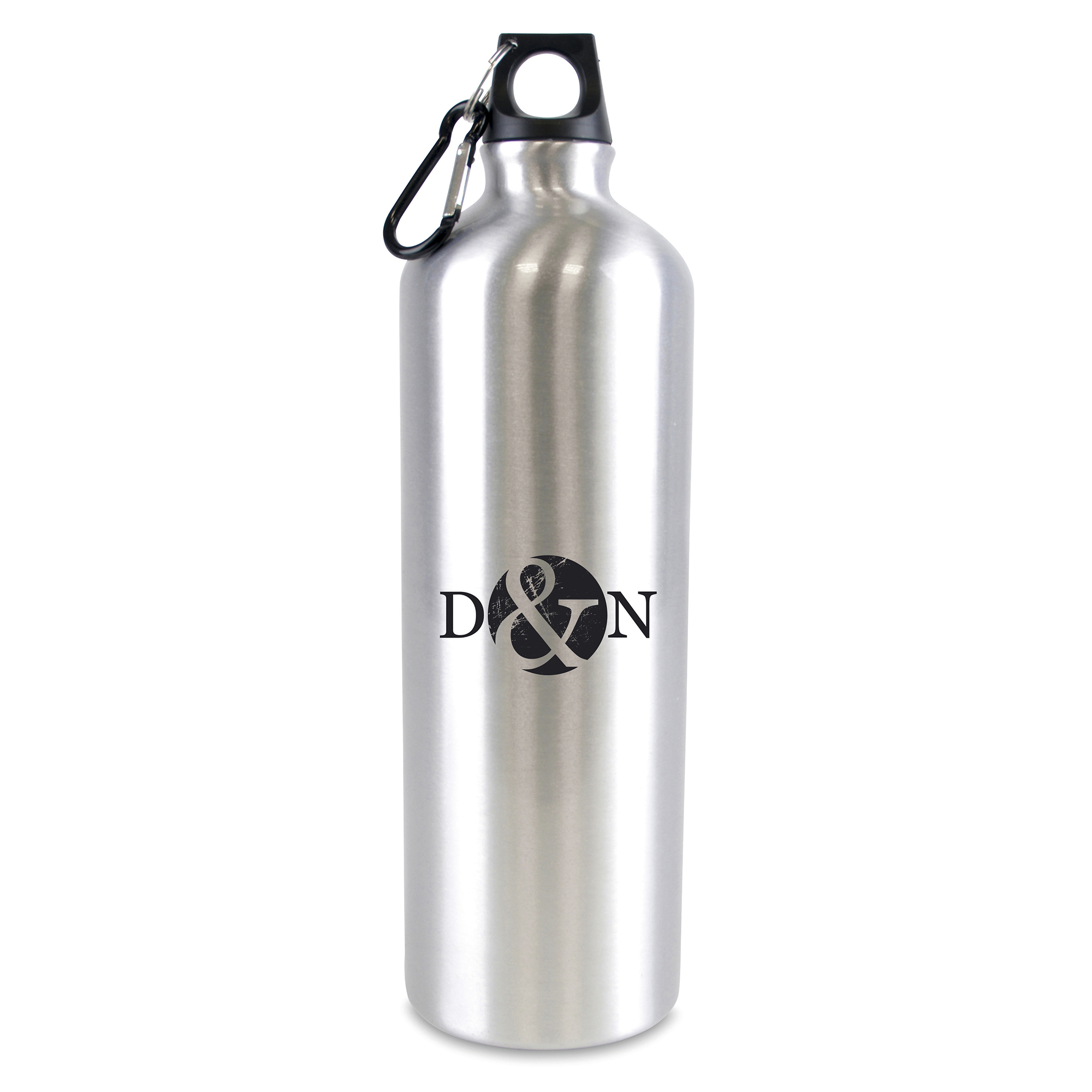 1 litre single walled, glossy aluminium sports bottle with a black PP plastic screw cap and black carabiner clip. BPA & PVC free.